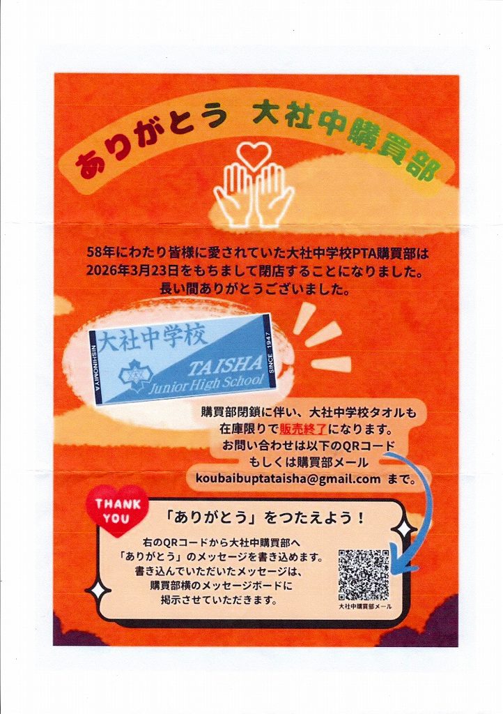 私たちがお世話になった大社中の購買部が閉店する事になったという事です。